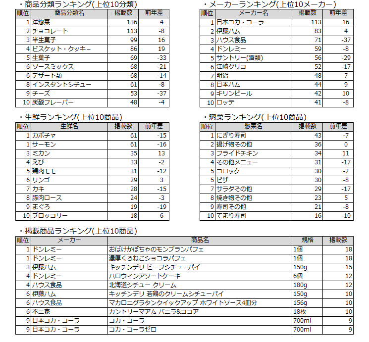 2025年のハロウィン企画では、「映えるデコスイーツ」と「簡便系温惣菜」が二大軸として存在感を放ちました。商品分類では「洋惣菜」「半生菓子」「ビスケット・クッキー」が前年を上回り、生鮮では主力の「カボチャ」「サーモン」が減少した一方、「ミカン」「リンゴ」などフルーツ系が微増し、色どり重視の傾向も見られました。惣菜は「フライドチキン」が大きく伸長し、手軽でボリューム感あるメニュー提案が目立ちました。メーカー別では「日本コカ・コーラ」「伊藤ハム」が掲載を伸ばし、飲料や温惣菜カテゴリの販促強化が見られました。また、「ドンレミー」などの個食スイーツが掲載商品ランキングを席巻し、“デコ+手軽さ”の融合が今企画の主流となったことがうかがえます。