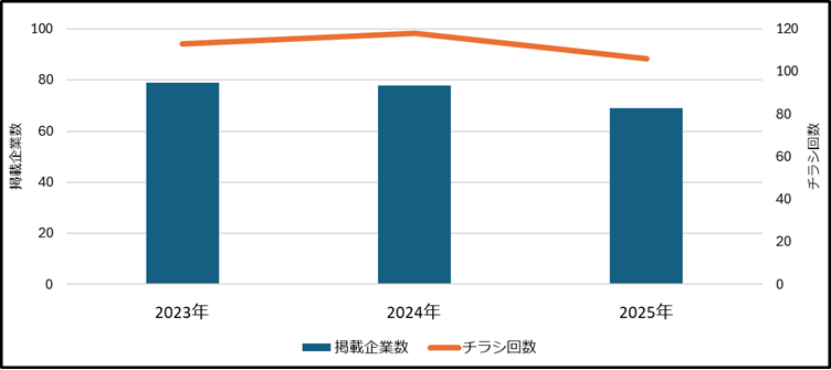 2025年の本企画の掲載企業数は定点100チェーンのうち69チェーン、チラシ掲載回数はのべ106回と、前年(78社/118回)、2023年(79社/113回)と比べて掲載規模は縮小傾向となりました。ピーク時(2018年)は主要チェーンのほとんどがチラシ展開をしていましたが、東京・渋谷での暴徒化などの影響から続くイベントパワーの低下は、今年も否めなかったようです。