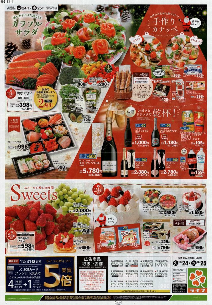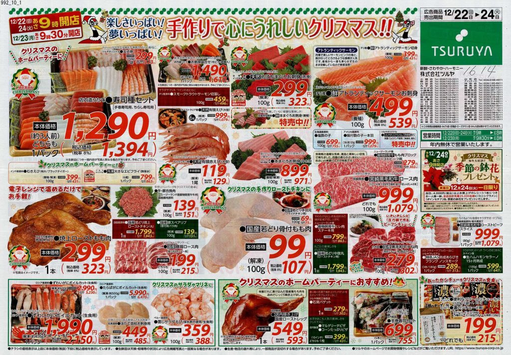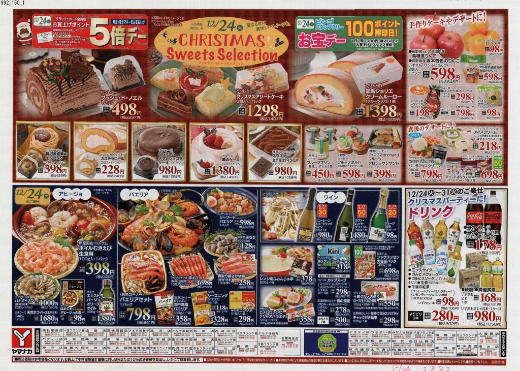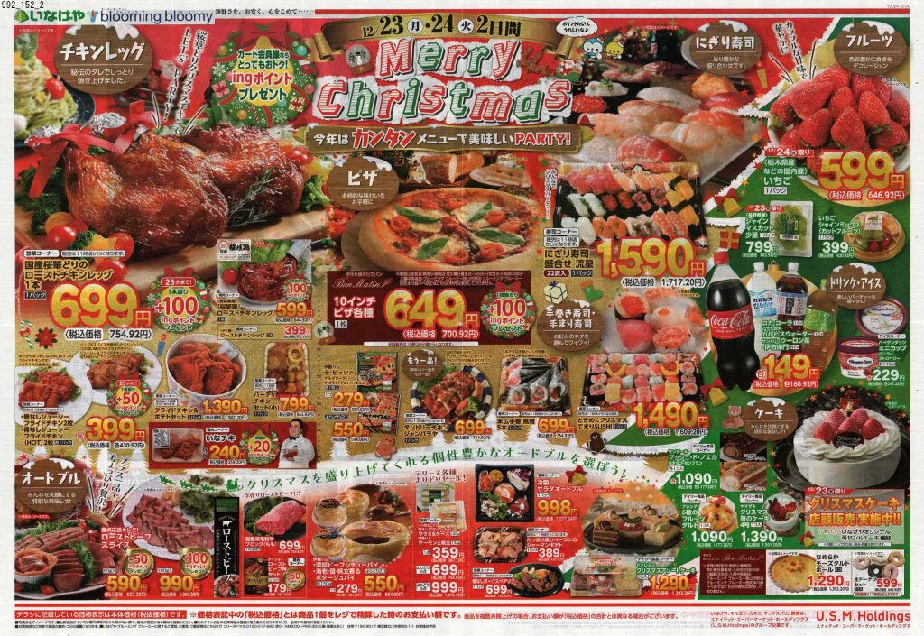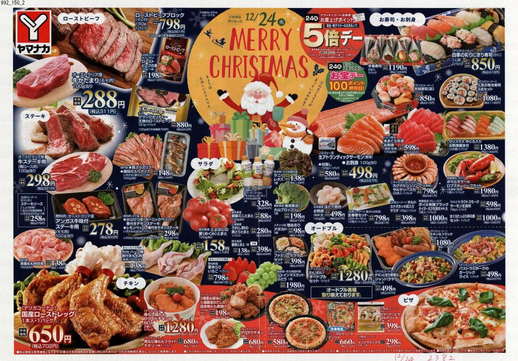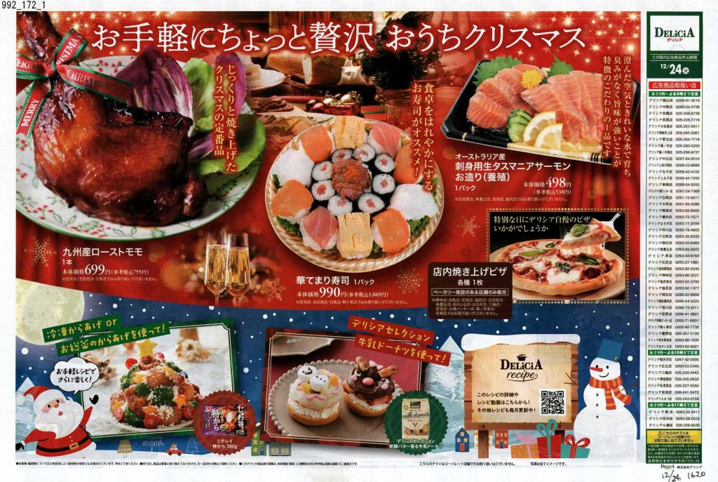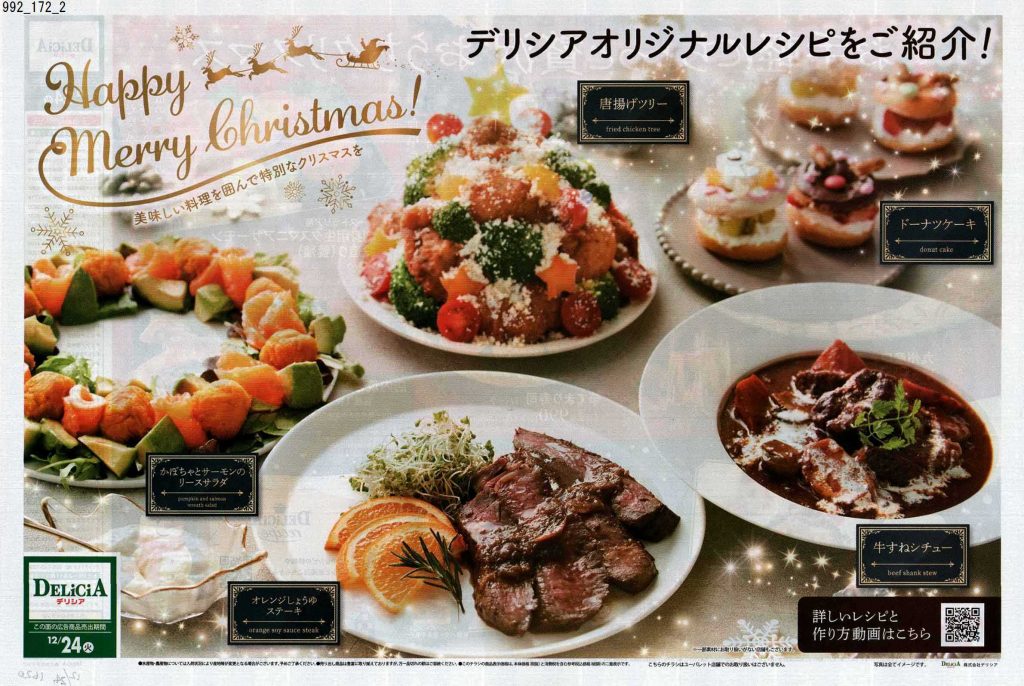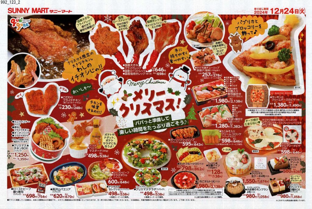 スーパーのチラシではなく、何かのカタログかな?と見紛うようなものがあったり、普段モノクロや二色刷りのチラシを発行するチェーンがカラーチラシだったり、それぞれ力の入りようが見ていて分かります。12月24日に出されるチラシは当然ながら惣菜系が多く提案されているので、チラシ掲載商品をいくつか買い揃えたらあっと言う間にクリスマスディナーの完成です。クリスマスチラシを見ていたら、チキンが食べたくなりました。当日は近所のスーパーで惣菜を買って帰ろうと固く誓った担当1号です。(きっとケーキも買います笑)皆さんはどのようなクリスマスを過ごされるのでしょうか。ぜひ近所のスーパーをチェックして美味しいものを調達してください。