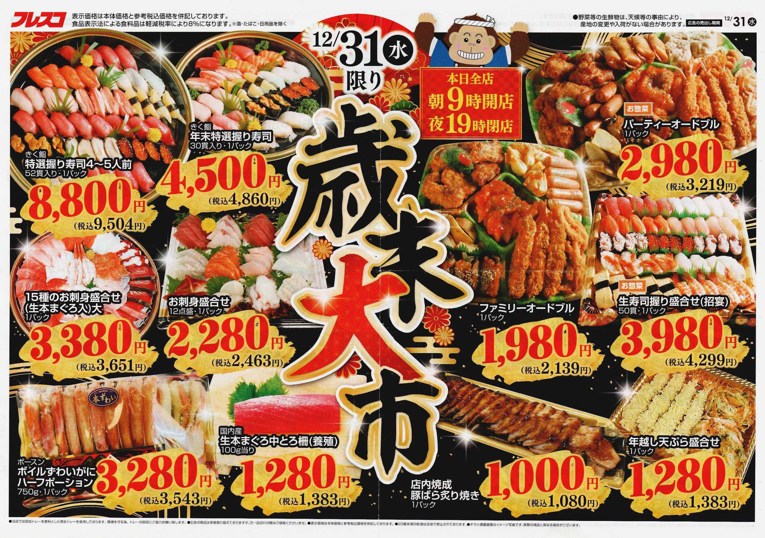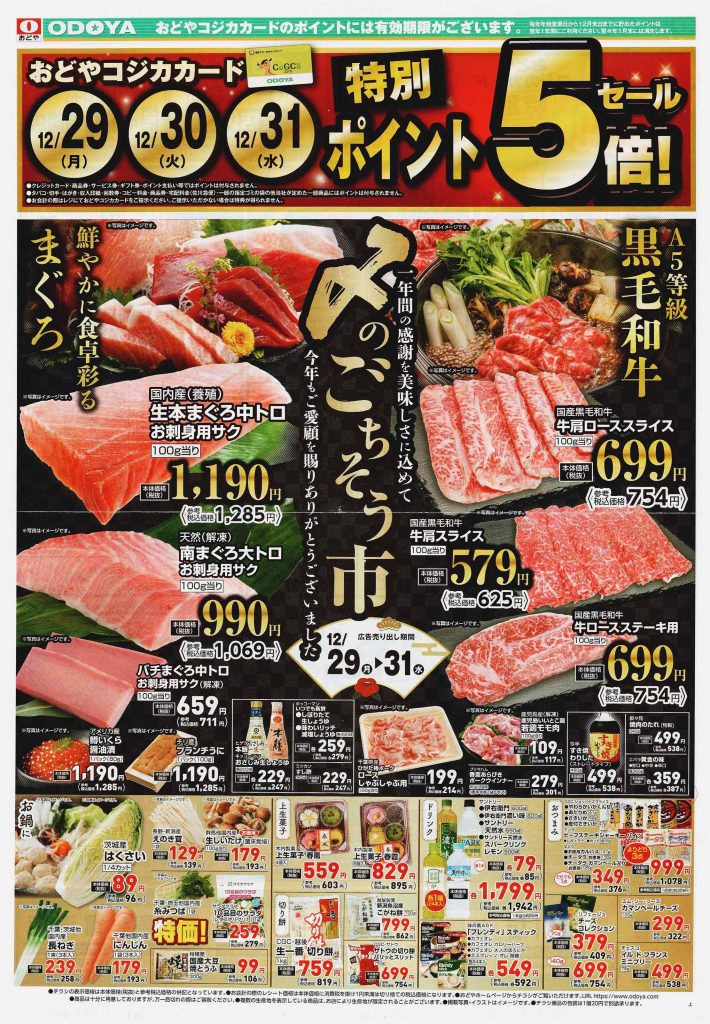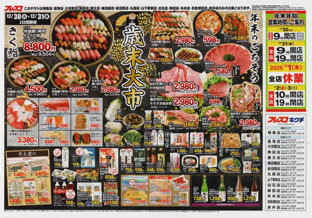 12/30-12/31の2日間開催チラシ(↑)を発行し、12/31に1日限りの惣菜や生鮮中心のチラシ(↓)を発行。「買い忘れないように!」と言われているようです。スーパーの「売るぞ!」という気合を感じました。