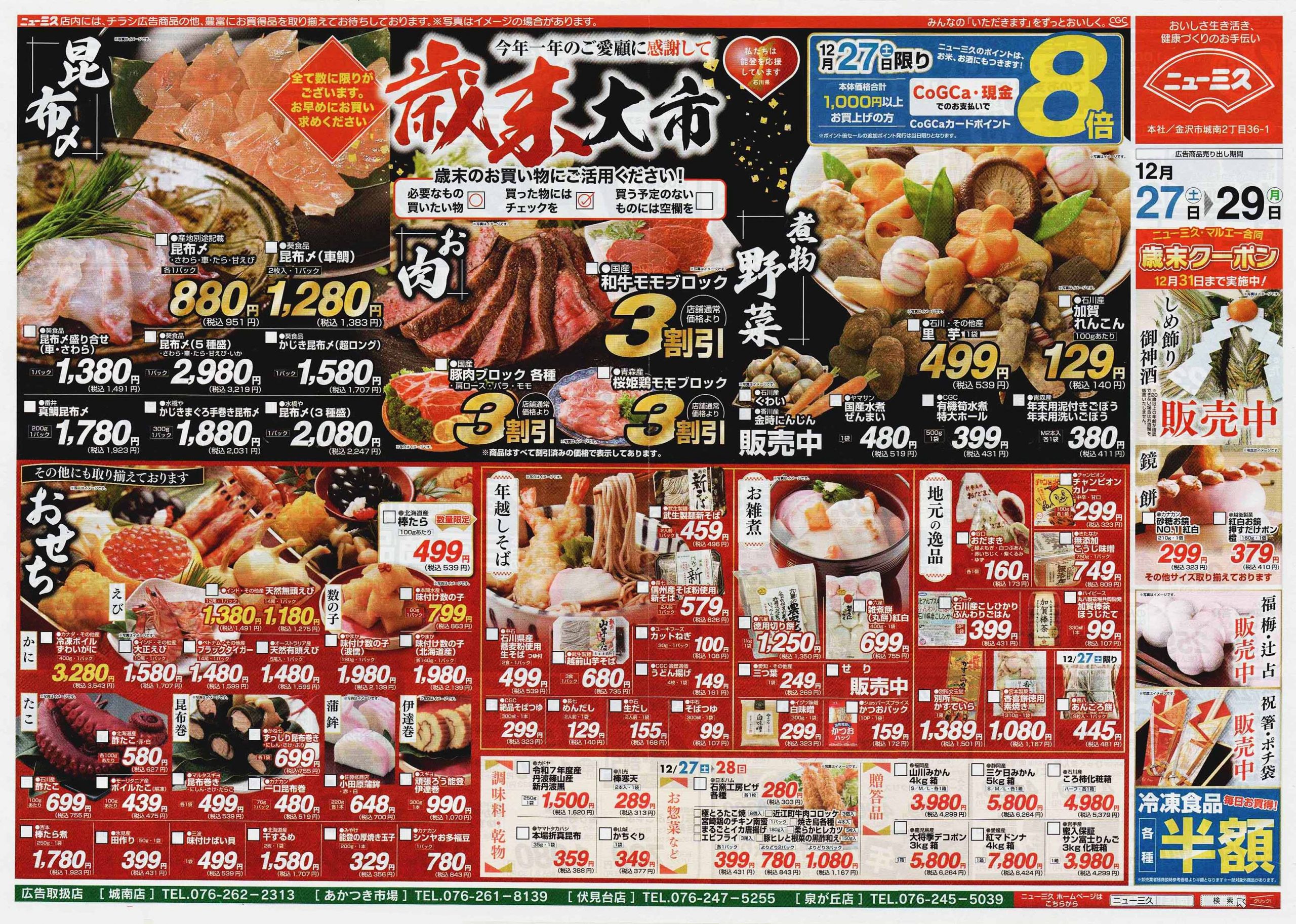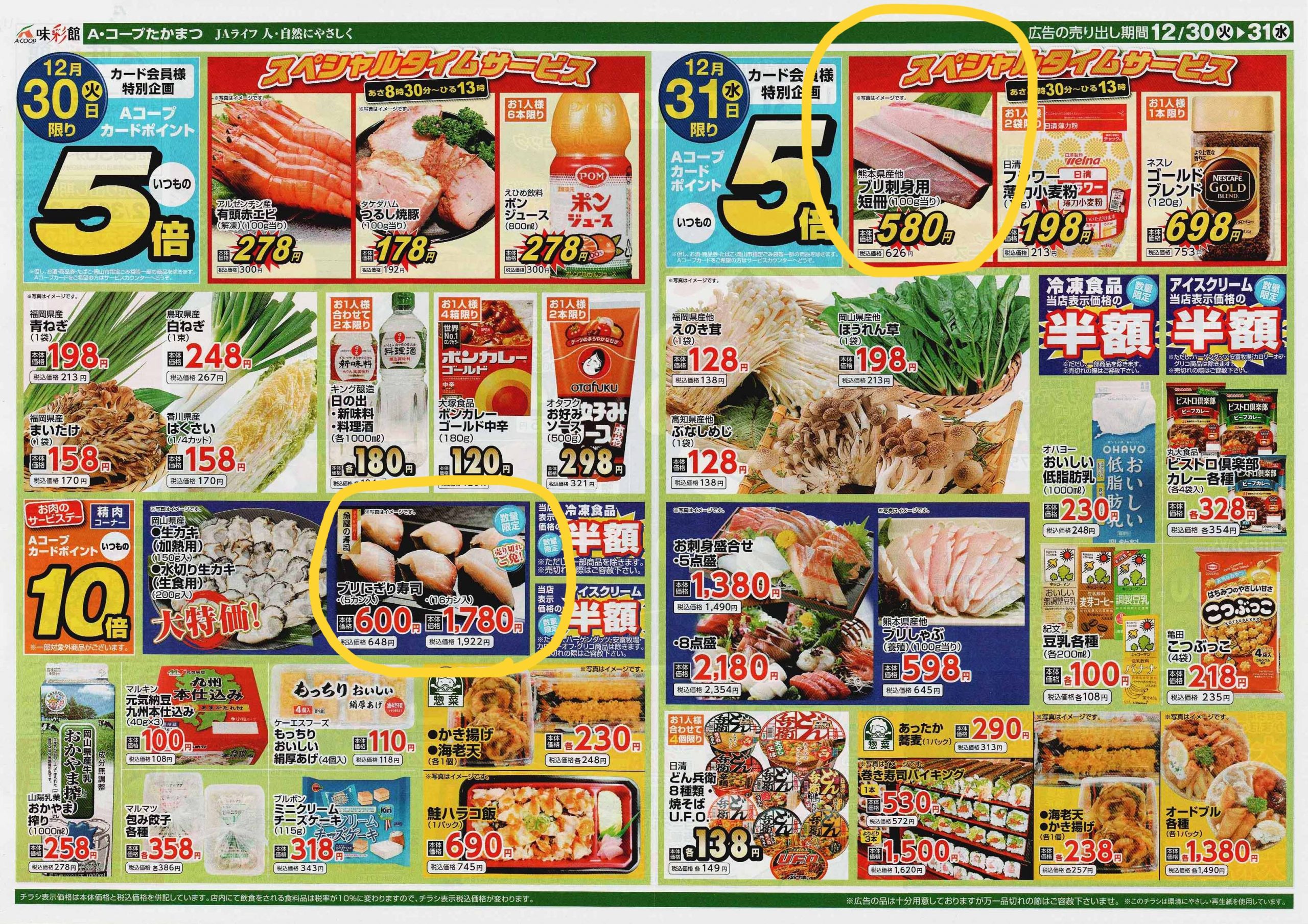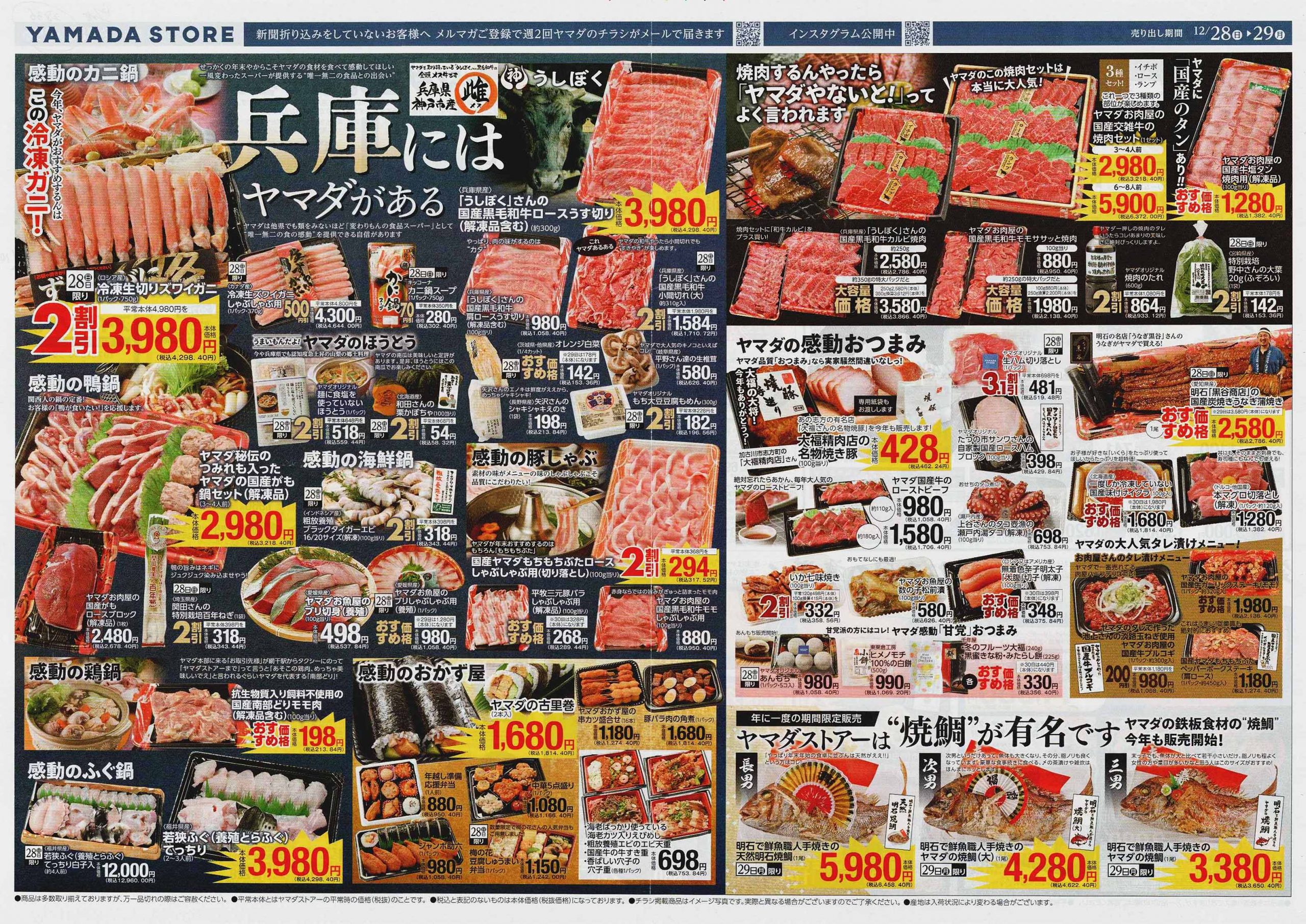 12/30-12/31の2日間開催チラシ(↑)を発行し、12/31に1日限りの惣菜や生鮮中心のチラシ(↓)を発行。「買い忘れないように!」と言われているようです。スーパーの「売るぞ!」という気合を感じました。