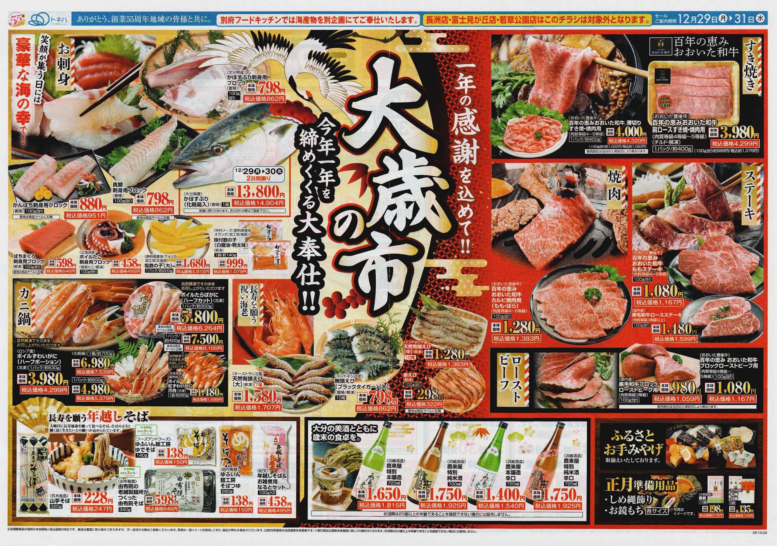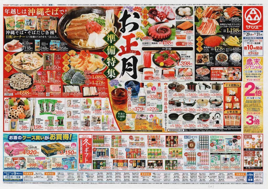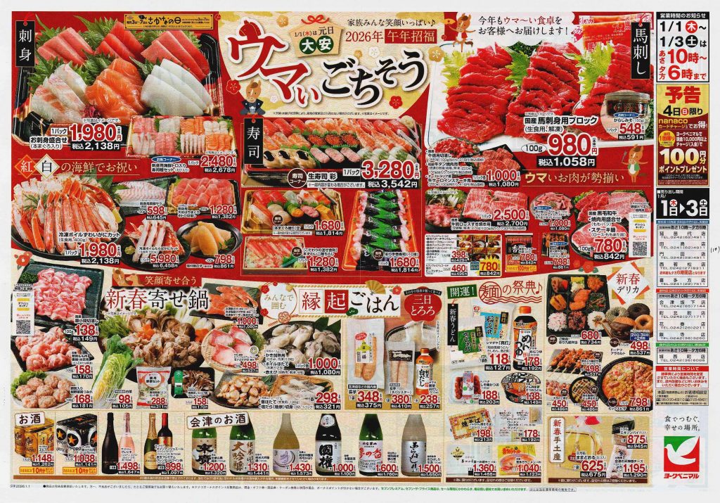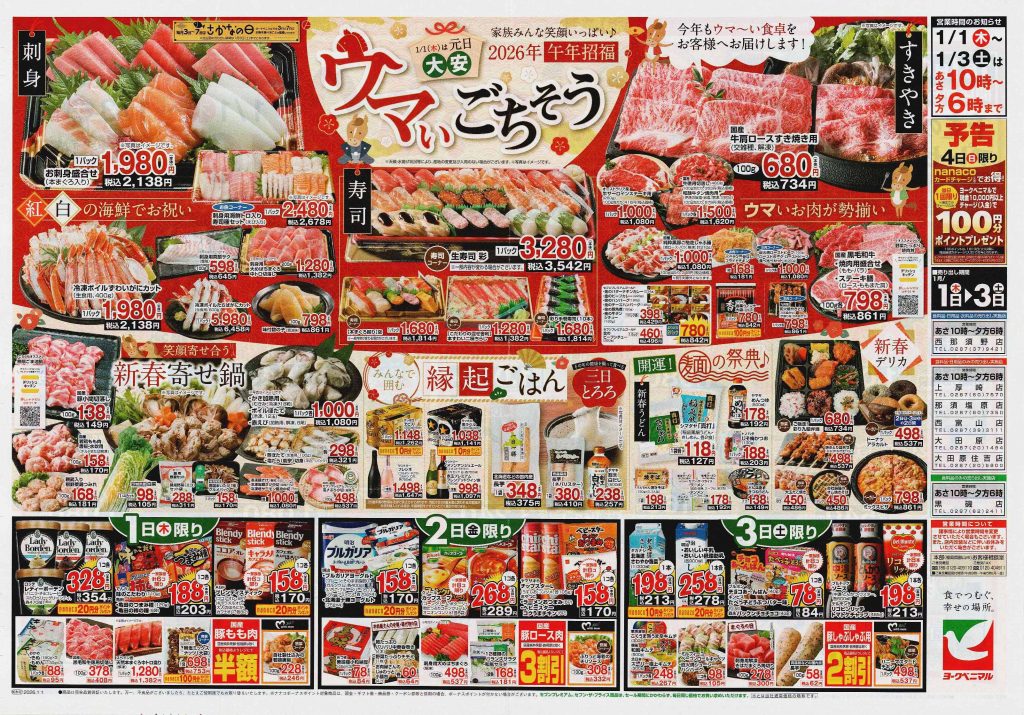 年末年始はご馳走を囲んで団欒できましたか?ゆっくり過ごせましたでしょうか。気が付いたら仕事始めから既に半月も過ぎていました。まだ一文字も書いていない!と慌ててチラシを見漁る担当1号です。年末年始のチラシは普段載らないお値段の張る商品などが見られますし、それぞれの地方の食文化や地元の銘菓など、各地方の正月が想像できます。2026年の1回目は正月(準備)チラシをご紹介します。