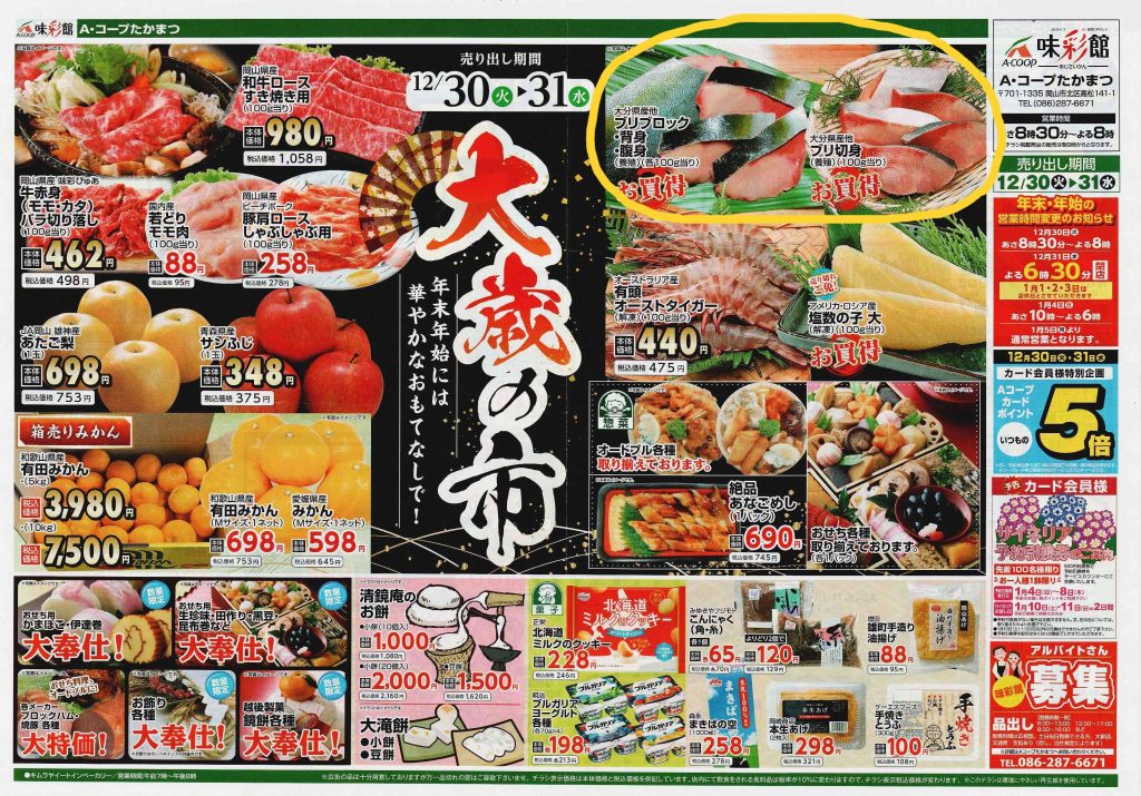 福岡県出身のスタッフと雑煮の話をしていたら、雑煮にブリが入っていると言うのです。そして餅はあん入りの丸餅。担当1号の脳内は大混乱。。。刺身もマグロではなくブリを食べるそうです。中国地方出身の上司も正月はブリだと話していました。出世魚であるブリは正月に相応しい縁起物ということなんだそうです。チラシを見ると、ブリが目立つ地方が結構ありました。マグロを1本まるごと買うことは難しいですが、ブリは1本まるごと販売しているスーパーを幾つか見かけました。ご家庭で捌くのでしょうか…。